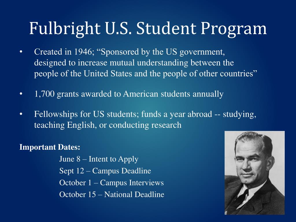 Fulbright U.S. Student Program • Created in 1946; “Sponsored by the US government, designed to increase mutual understanding between the people of the United States and the people of other countries” • 1,700 grants awarded to American students annually • Fellowships for US students; funds a year abroad -- studying, teaching English, or conducting research Important Dates: June 8 – Intent to Apply Sept 12 – Campus Deadline October 1 – Campus Interviews October 15 – National Deadline