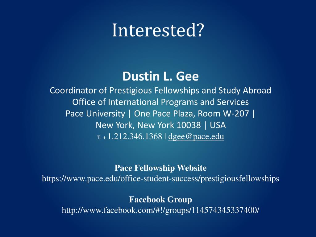 Interested? Dustin L. Gee Coordinator of Prestigious Fellowships and Study Abroad Office of International Programs and Services Pace University | One Pace Plaza, Room W-207 | New York, New York 10038 | USA T: + 1.212.346.1368 | dgee@pace.edu Pace Fellowship Website https://www.pace.edu/office-student-success/prestigiousfellowships Facebook Group http://www.facebook.com/#!/groups/114574345337400/