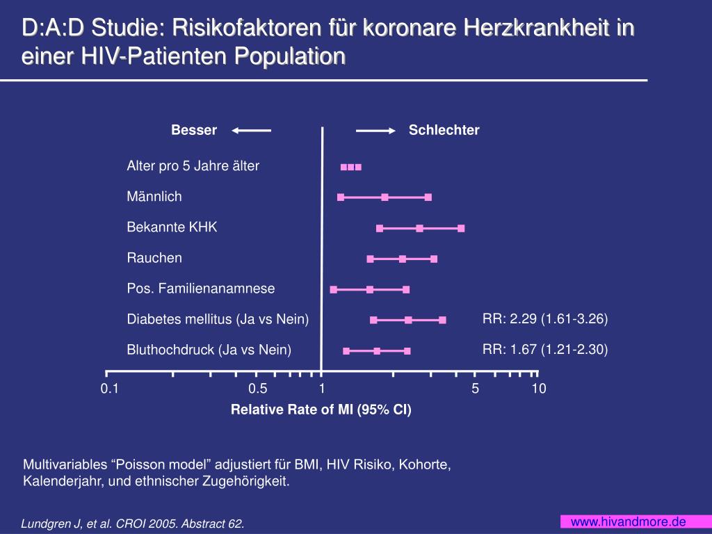 D:A:D Studie: Risikofaktoren für koronare Herzkrankheit in einer HIV-Patienten Population Besser Schlechter Alter pro 5 Jahre älter Männlich Bekannte KHK Rauchen Pos. Familienanamnese RR: 2.29 (1.61-3.26) Diabetes mellitus (Ja vs Nein) RR: 1.67 (1.21-2.30) Bluthochdruck (Ja vs Nein) 0.1 0.5 1 5 10 Relative Rate of MI (95% CI) Multivariables “Poisson model” adjustiert für BMI, HIV Risiko, Kohorte, Kalenderjahr, und ethnischer Zugehörigkeit. Lundgren J, et al. CROI 2005. Abstract 62.