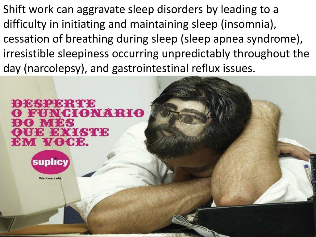 Shift work can aggravate sleep disorders by leading to a difficulty in initiating and maintaining sleep (insomnia), cessation of breathing during sleep (sleep apnea syndrome), irresistible sleepiness occurring unpredictably throughout the day (narcolepsy), and gastrointestinal reflux issues.