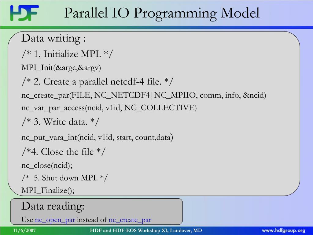 Parallel IO Programming Model Data writing : /* 1. Initialize MPI. */ MPI_Init(&argc,&argv) /* 2. Create a parallel netcdf-4 file. */ nc_create_par(FILE, NC_NETCDF4|NC_MPIIO, comm, info, &ncid) nc_var_par_access(ncid, v1id, NC_COLLECTIVE) /* 3. Write data. */ nc_put_vara_int(ncid, v1id, start, count,data) /*4. Close the file */ nc_close(ncid); /* 5. Shut down MPI. */ MPI_Finalize(); Data reading: Use nc_open_par instead of nc_create_par HDF and HDF-EOS Workshop XI, Landover, MD