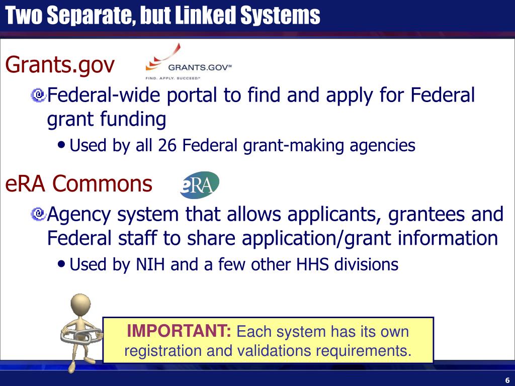 Two Separate, but Linked Systems • Grants.gov • Federal-wide portal to find and apply for Federal grant funding • Used by all 26 Federal grant-making agencies • eRA Commons • Agency system that allows applicants, grantees and Federal staff to share application/grant information • Used by NIH and a few other HHS divisions IMPORTANT: Each system has its own registration and validations requirements.