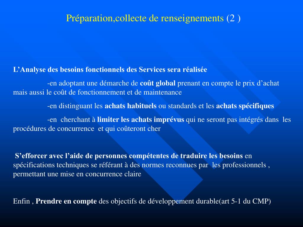 Préparation,collecte de renseignements (2 ) L’Analyse des besoins fonctionnels des Services sera réalisée -en adoptant une démarche de coût global prenant en compte le prix d’achat mais aussi le coût de fonctionnement et de maintenance -en distinguant les achats habituels ou standards et les achats spécifiques -en cherchant à limiter les achats imprévus qui ne seront pas intégrés dans les procédures de concurrence et qui coûteront cher S’efforcer avec l’aide de personnes compétentes de traduire les besoins en spécifications techniques se référant à des normes reconnues par les professionnels , permettant une mise en concurrence claire Enfin , Prendre en compte des objectifs de développement durable(art 5-1 du CMP)