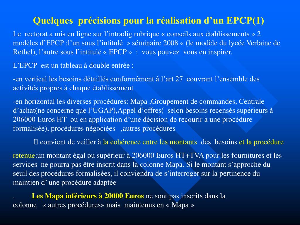 Quelques précisions pour la réalisation d’un EPCP(1) Le rectorat a mis en ligne sur l’intradig rubrique « conseils aux établissements » 2 modèles d’EPCP :l’un sous l’intitulé » séminaire 2008 « (le modèle du lycée Verlaine de Rethel), l’autre sous l’intitulé « EPCP » : vous pouvez vous en inspirer. L’EPCP est un tableau à double entrée : -en vertical les besoins détaillés conformément à l’art 27 couvrant l’ensemble des activités propres à chaque établissement -en horizontal les diverses procédures: Mapa ,Groupement de commandes, Centrale d’achat(ne concerne que l’UGAP),Appel d’offres( selon besoins recensés supérieurs à 206000 Euros HT ou en application d’une décision de recourir à une procédure formalisée), procédures négociées ,autres procédures Il convient de veiller à la cohérence entre les montants des besoins et la procédure retenue:un montant égal ou supérieur à 206000 Euros HT+TVA pour les fournitures et les services ne pourra pas être inscrit dans la colonne Mapa. Si le montant s’approche du seuil des procédures formalisées, il conviendra de s’interroger sur la pertinence du maintien d’ une procédure adaptée . Les Mapa inférieurs à 20000 Euros ne sont pas inscrits dans la colonne « autres procédures» mais maintenus en « Mapa »