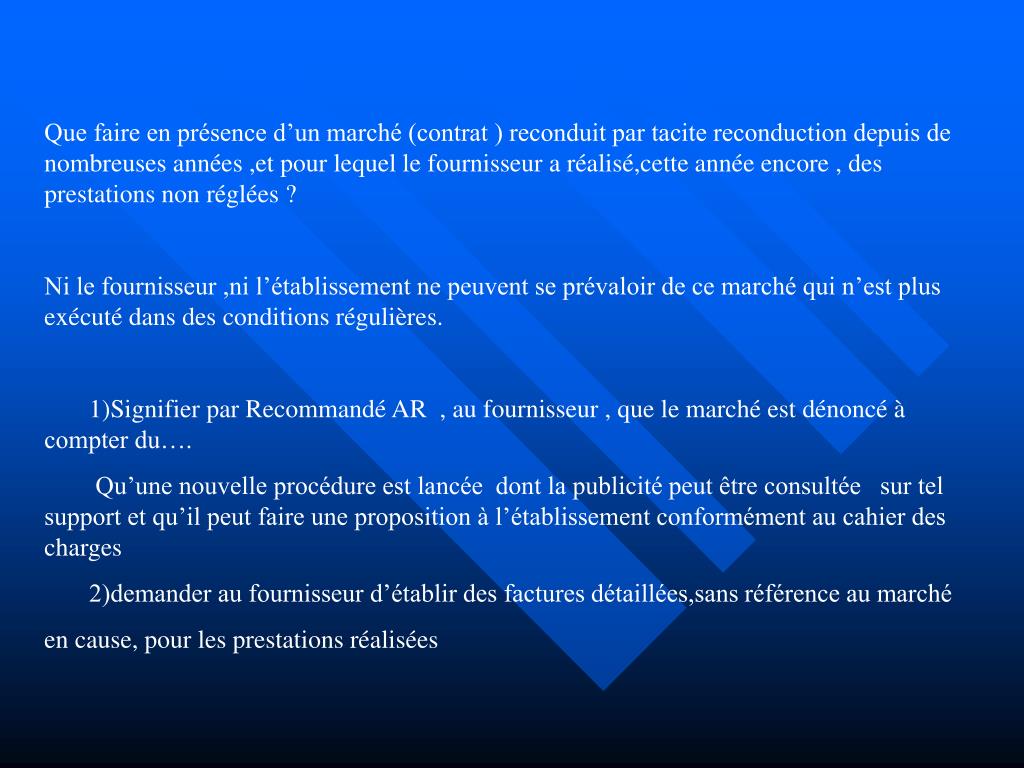 Que faire en présence d’un marché (contrat ) reconduit par tacite reconduction depuis de nombreuses années ,et pour lequel le fournisseur a réalisé,cette année encore , des prestations non réglées ? Ni le fournisseur ,ni l’établissement ne peuvent se prévaloir de ce marché qui n’est plus exécuté dans des conditions régulières. 1)Signifier par Recommandé AR , au fournisseur , que le marché est dénoncé à compter du…. Qu’une nouvelle procédure est lancée dont la publicité peut être consultée sur tel support et qu’il peut faire une proposition à l’établissement conformément au cahier des charges 2)demander au fournisseur d’établir des factures détaillées,sans référence au marché en cause, pour les prestations réalisées