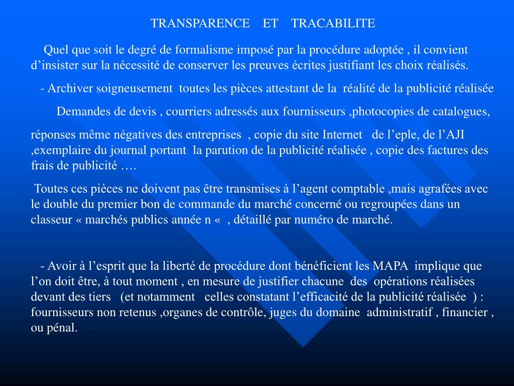 TRANSPARENCE ET TRACABILITE Quel que soit le degré de formalisme imposé par la procédure adoptée , il convient d’insister sur la nécessité de conserver les preuves écrites justifiant les choix réalisés. - Archiver soigneusement toutes les pièces attestant de la réalité de la publicité réalisée Demandes de devis , courriers adressés aux fournisseurs ,photocopies de catalogues, réponses même négatives des entreprises , copie du site Internet de l’eple, de l’AJI ,exemplaire du journal portant la parution de la publicité réalisée , copie des factures des frais de publicité …. Toutes ces pièces ne doivent pas être transmises à l’agent comptable ,mais agrafées avec le double du premier bon de commande du marché concerné ou regroupées dans un classeur « marchés publics année n « , détaillé par numéro de marché. - Avoir à l’esprit que la liberté de procédure dont bénéficient les MAPA implique que l’on doit être, à tout moment , en mesure de justifier chacune des opérations réalisées devant des tiers (et notamment celles constatant l’efficacité de la publicité réalisée ) : fournisseurs non retenus ,organes de contrôle, juges du domaine administratif , financier , ou pénal.
