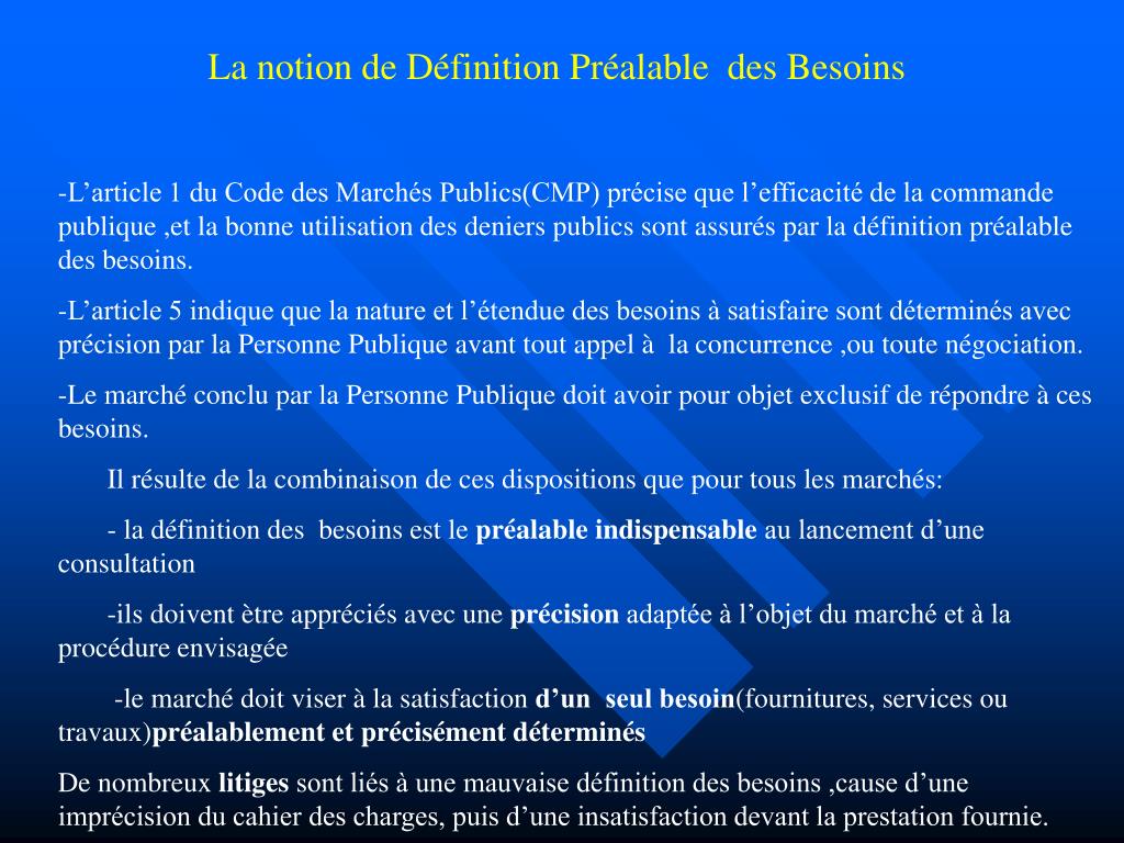 La notion de Définition Préalable des Besoins -L’article 1 du Code des Marchés Publics(CMP) précise que l’efficacité de la commande publique ,et la bonne utilisation des deniers publics sont assurés par la définition préalable des besoins. -L’article 5 indique que la nature et l’étendue des besoins à satisfaire sont déterminés avec précision par la Personne Publique avant tout appel à la concurrence ,ou toute négociation. -Le marché conclu par la Personne Publique doit avoir pour objet exclusif de répondre à ces besoins. Il résulte de la combinaison de ces dispositions que pour tous les marchés: - la définition des besoins est le préalable indispensable au lancement d’une consultation -ils doivent ètre appréciés avec une précision adaptée à l’objet du marché et à la procédure envisagée -le marché doit viser à la satisfaction d’un seul besoin(fournitures, services ou travaux)préalablement et précisément déterminés De nombreux litiges sont liés à une mauvaise définition des besoins ,cause d’une imprécision du cahier des charges, puis d’une insatisfaction devant la prestation fournie.