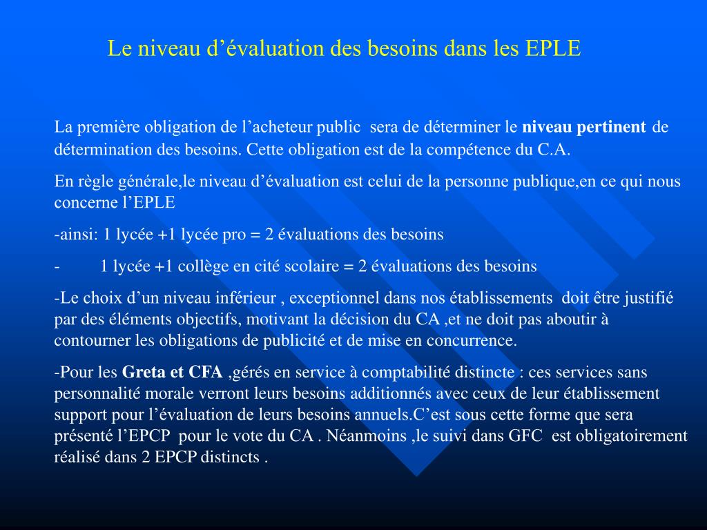 Le niveau d’évaluation des besoins dans les EPLE • La première obligation de l’acheteur public sera de déterminer le niveau pertinentde détermination des besoins. Cette obligation est de la compétence du C.A. • En règle générale,le niveau d’évaluation est celui de la personne publique,en ce qui nous concerne l’EPLE • ainsi: 1 lycée +1 lycée pro = 2 évaluations des besoins • 1 lycée +1 collège en cité scolaire = 2 évaluations des besoins • Le choix d’un niveau inférieur , exceptionnel dans nos établissements doit être justifié par des éléments objectifs, motivant la décision du CA ,et ne doit pas aboutir à contourner les obligations de publicité et de mise en concurrence. • Pour les Greta et CFA ,gérés en service à comptabilité distincte : ces services sans personnalité morale verront leurs besoins additionnés avec ceux de leur établissement support pour l’évaluation de leurs besoins annuels.C’est sous cette forme que sera présenté l’EPCP pour le vote du CA . Néanmoins ,le suivi dans GFC est obligatoirement réalisé dans 2 EPCP distincts .