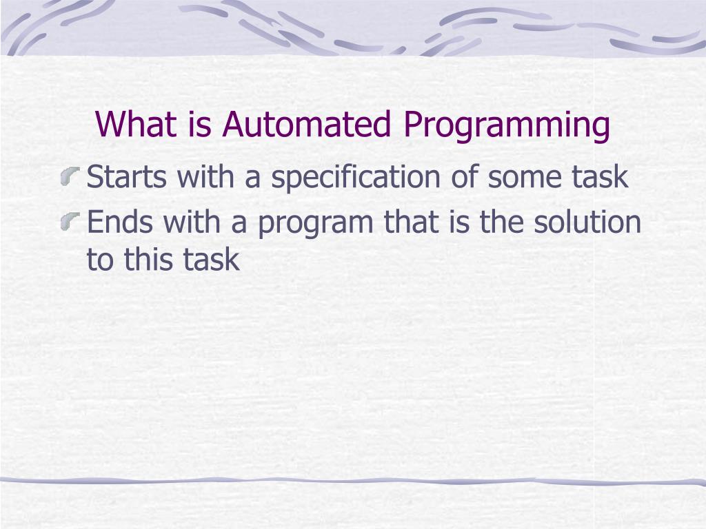 What is Automated Programming • Starts with a specification of some task • Ends with a program that is the solution to this task