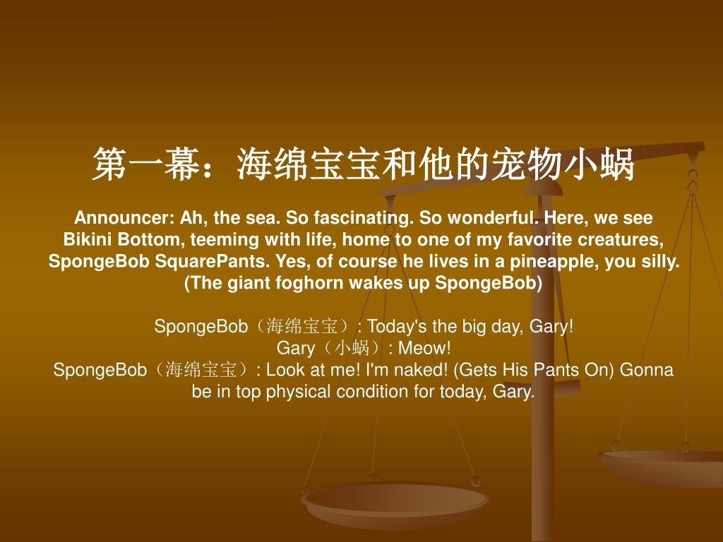 第一幕:海绵宝宝和他的宠物小蜗 Announcer: Ah, the sea. So fascinating. So wonderful. Here, we see Bikini Bottom, teeming with life, home to one of my favorite creatures, SpongeBob SquarePants. Yes, of course he lives in a pineapple, you silly. (The giant foghorn wakes up SpongeBob) SpongeBob(海绵宝宝): Today's the big day, Gary! Gary(小蜗): Meow! SpongeBob(海绵宝宝): Look at me! I'm naked! (Gets His Pants On) Gonna be in top physical condition for today, Gary.