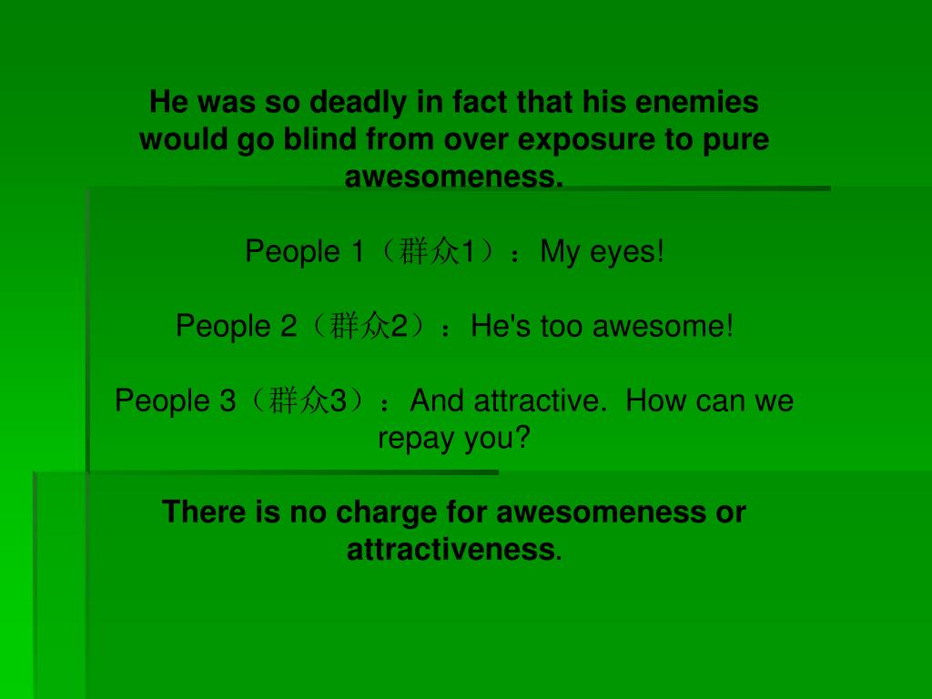 He was so deadly in fact that his enemies would go blind from over exposure to pure awesomeness. People 1(群众1):My eyes! People 2(群众2):He's too awesome! People 3(群众3):And attractive. How can we repay you? There is no charge for awesomeness or attractiveness.