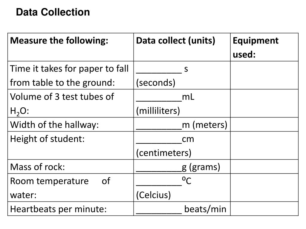 I. Measuring • Units • Fill in the following units and symbols missing in the table. • Why is it important to use units when collecting data? _________________________________________________
