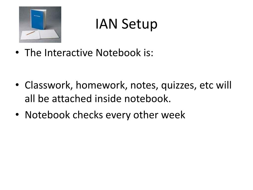 IAN Setup • The Interactive Notebook is: • Classwork, homework, notes, quizzes, etc will all be attached inside notebook. • Notebook checks every other week