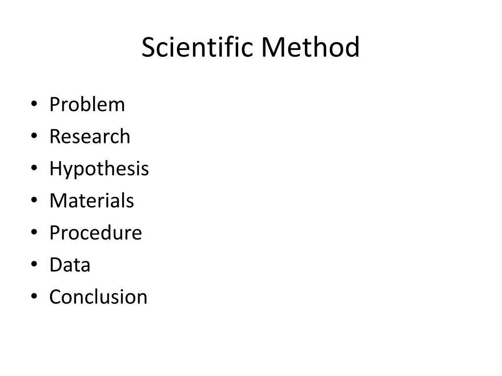 Scientific Method • Problem • Research • Hypothesis • Materials • Procedure • Data • Conclusion