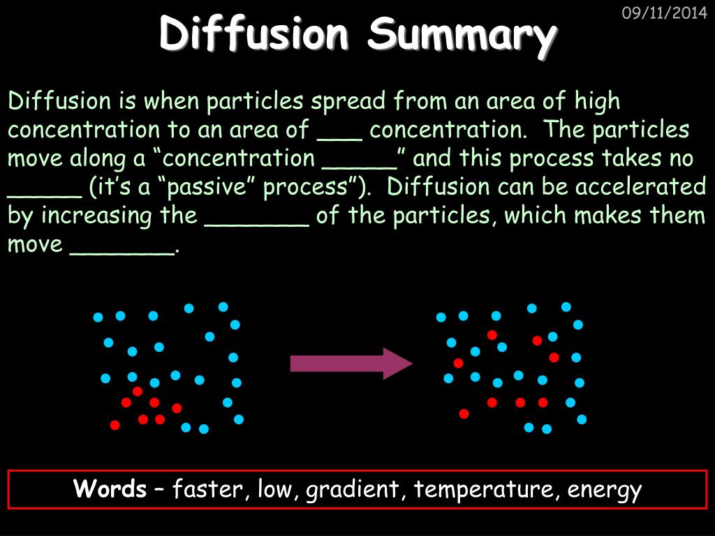 Diffusion Summary Diffusion is when particles spread from an area of high concentration to an area of ___ concentration. The particles move along a “concentration _____” and this process takes no _____ (it’s a “passive” process”). Diffusion can be accelerated by increasing the _______ of the particles, which makes them move _______. Words – faster, low, gradient, temperature, energy