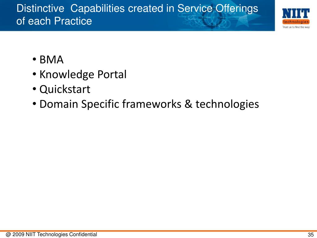Distinctive Capabilities created in Service Offerings of each Practice • BMA • Knowledge Portal • Quickstart • Domain Specific frameworks & technologies