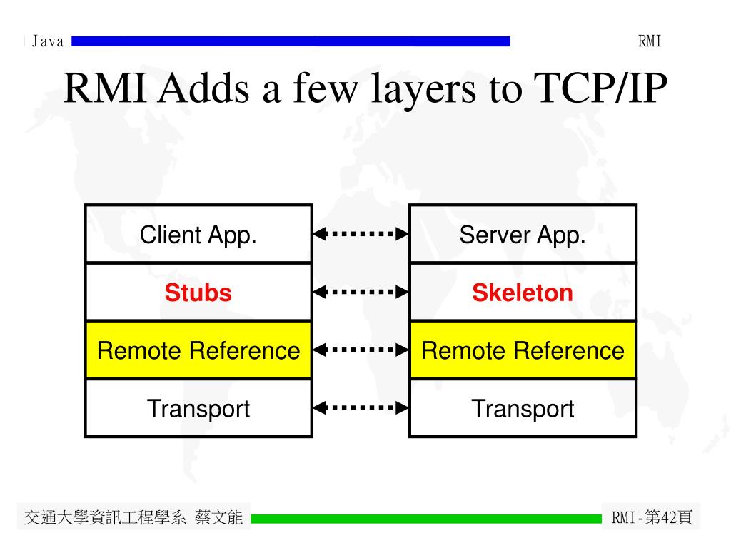 Stub • Stub (存根; 客戶端代理) • Client side • Acts as an implementation of a remote interface • Communicates with the real object over the network • The stub class is generated from corresponding remote class by the RMI compiler rmic Note: As of the J2SE 5.0 release, stub classes for remote objects no longer need to be pregenerated using the rmic stub compiler, unless the remote object needs to support clients running in pre-5.0 VMs.