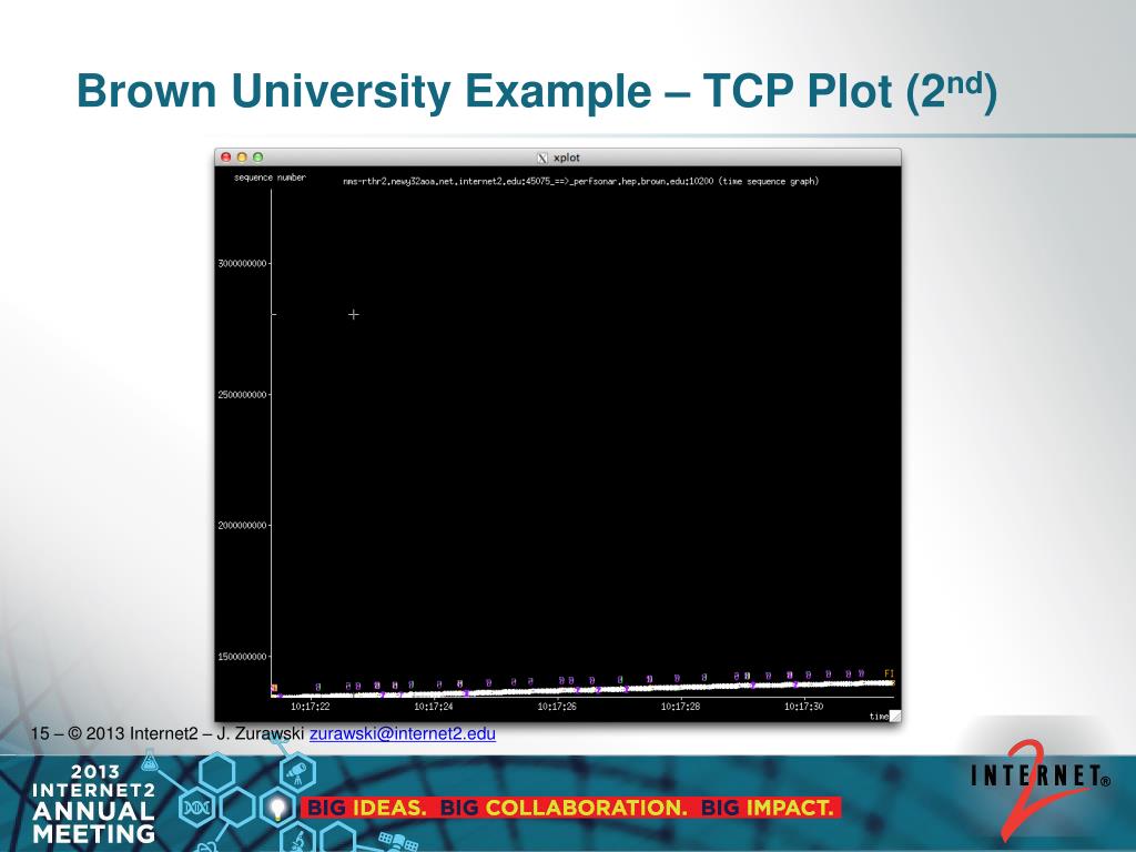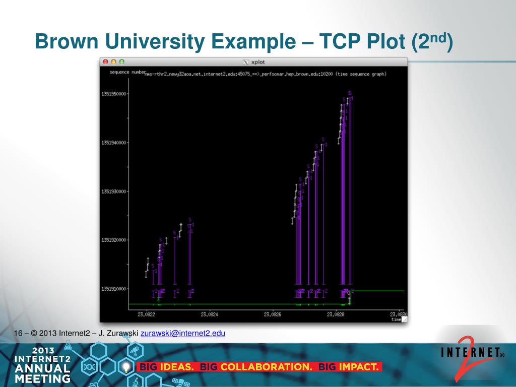 Brown University Example – TCP Dynamics • ‘Inbound’, filtered: • nuttcp -r -T 10 -i 1 -p 10200 bwctl.newy.net.internet2.edu • 4.5625 MB / 1.00 sec = 38.1995 Mbps 13 retrans • 4.8750 MB / 1.00 sec = 40.8956 Mbps 4 retrans • 4.8750 MB / 1.00 sec = 40.8954 Mbps 6 retrans • 6.4375 MB / 1.00 sec = 54.0024 Mbps 9 retrans • 5.7500 MB / 1.00 sec = 48.2310 Mbps 8 retrans • 5.8750 MB / 1.00 sec = 49.2880 Mbps 5 retrans • 6.3125 MB / 1.00 sec = 52.9006 Mbps 3 retrans • 5.3125 MB / 1.00 sec = 44.5653 Mbps 7 retrans • 4.3125 MB / 1.00 sec = 36.2108 Mbps 7 retrans • 5.1875 MB / 1.00 sec = 43.5186 Mbps 8 retrans • 53.7519 MB / 10.07 sec = 44.7577 Mbps 0 %TX 1 %RX 70 retrans 8.29 msRTT