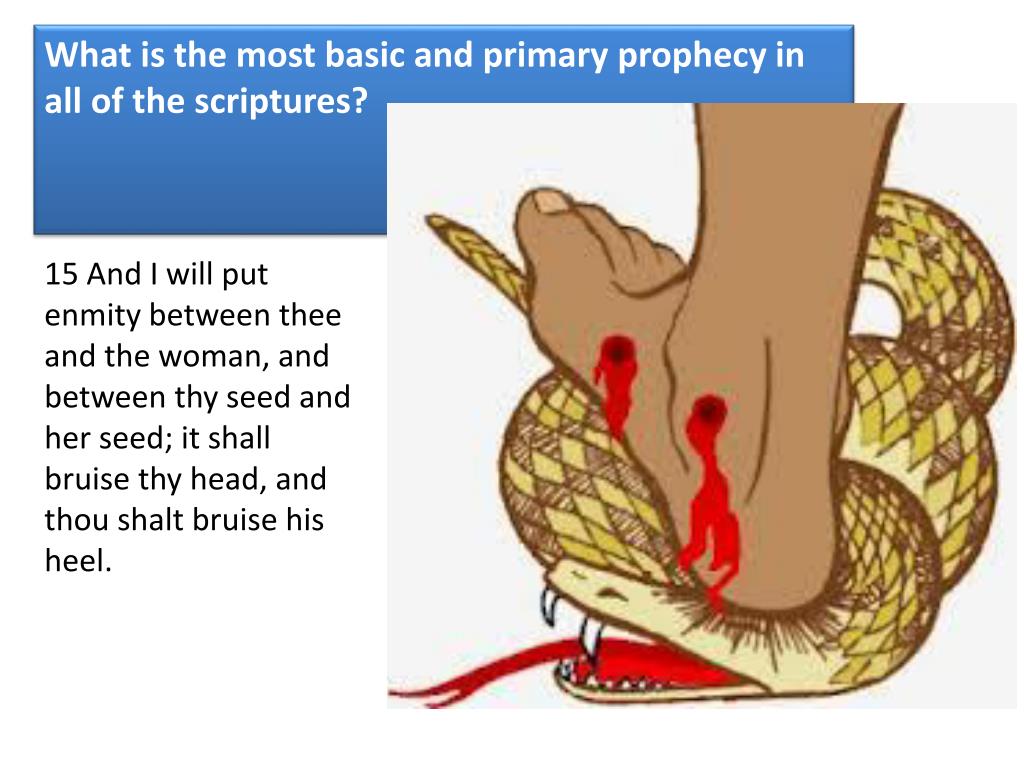 What is the most basic and primary prophecy in all of the scriptures? 15 And I will put enmity between thee and the woman, and between thy seed and her seed; it shall bruise thy head, and thou shalt bruise his heel.