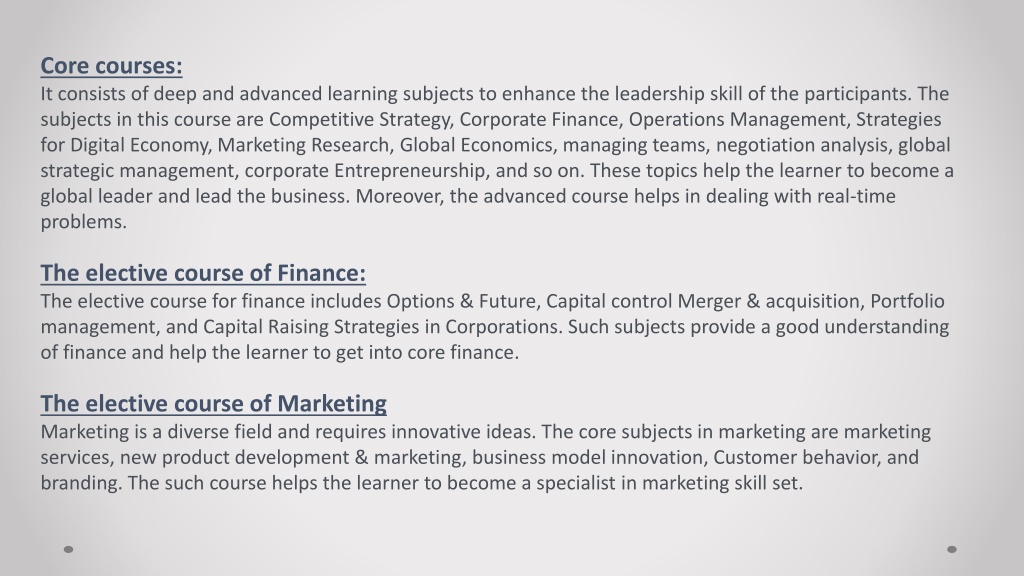Core courses: It consists of deep and advanced learning subjects to enhance the leadership skill of the participants. The subjects in this course are Competitive Strategy, Corporate Finance, Operations Management, Strategies for Digital Economy, Marketing Research, Global Economics, managing teams, negotiation analysis, global strategic management, corporate Entrepreneurship, and so on. These topics help the learner to become a global leader and lead the business. Moreover, the advanced course helps in dealing with real-time problems. The elective course of Finance: The elective course for finance includes Options & Future, Capital control Merger & acquisition, Portfolio management, and Capital Raising Strategies in Corporations. Such subjects provide a good understanding of finance and help the learner to get into core finance. The elective course of Marketing Marketing is a diverse field and requires innovative ideas. The core subjects in marketing are marketing services, new product development & marketing, business model innovation, Customer behavior, and branding. The such course helps the learner to become a specialist in marketing skill set.