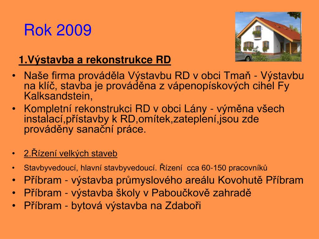 Rok 2009 1.Výstavba a rekonstrukce RD • Naše firma prováděla Výstavbu RD v obci Tmaň - Výstavbu na klíč, stavba je prováděna z vápenopískových cihel Fy Kalksandstein, • Kompletní rekonstrukci RD v obci Lány - výměna všech instalací,přístavby k RD,omítek,zateplení,jsou zde prováděny sanační práce. • 2.Řízení velkých staveb • Stavbyvedoucí, hlavní stavbyvedoucí. Řízení cca 60-150 pracovníků • Příbram - výstavba průmyslového areálu Kovohutě Příbram • Příbram - výstavba školy v Paboučkově zahradě • Příbram - bytová výstavba na Zdaboři