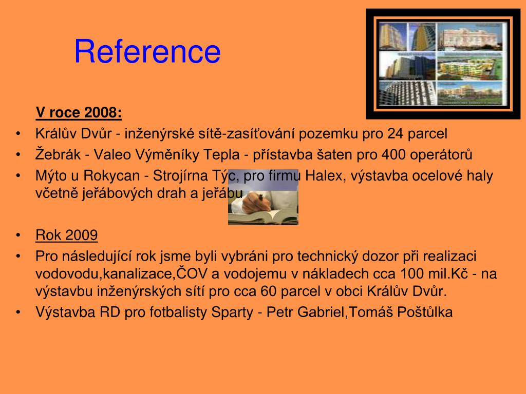 Reference V roce 2008: • Králův Dvůr - inženýrské sítě-zasíťování pozemku pro 24 parcel • Žebrák - Valeo Výměníky Tepla - přístavba šaten pro 400 operátorů • Mýto u Rokycan - Strojírna Týc, pro firmu Halex, výstavba ocelové haly včetně jeřábových drah a jeřábu • Rok 2009 • Pro následující rok jsme byli vybráni pro technický dozor při realizaci vodovodu,kanalizace,ČOV a vodojemu v nákladech cca 100 mil.Kč - na výstavbu inženýrských sítí pro cca 60 parcel v obci Králův Dvůr. • Výstavba RD pro fotbalisty Sparty - Petr Gabriel,Tomáš Poštůlka