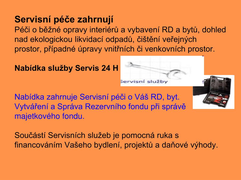Servisní péče zahrnují Péči o běžné opravy interiérů a vybavení RD a bytů, dohled nad ekologickou likvidací odpadů, čištění veřejných prostor, případné úpravy vnitřních či venkovních prostor. Nabídka služby Servis 24 H Nabídka zahrnuje Servisní péči o Váš RD, byt. Vytváření a Správa Rezervního fondu při správě majetkového fondu. Součástí Servisních služeb je pomocná ruka s financováním Vašeho bydlení, projektů a daňové výhody.