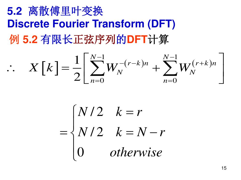 5.2 离散傅里叶变换Discrete Fourier Transform (DFT) DFT定义中引入一个常用的符号 证明IDFT表达式: 证明:在两边同乘以 WNln,从 n = 0到n=N-1作