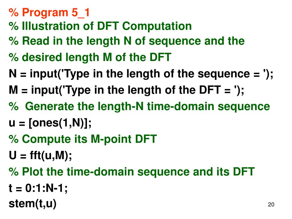 % Program 5_1 % Illustration of DFT Computation %Read in the length N of sequence and the % desired length M of the DFT N = input('Type in the length of the sequence = '); M = input('Type in the length of the DFT = '); % Generate the length-N time-domain sequence u = [ones(1,N)]; % Compute its M-point DFT U = fft(u,M); % Plot the time-domain sequence and its DFT t = 0:1:N-1; stem(t,u)