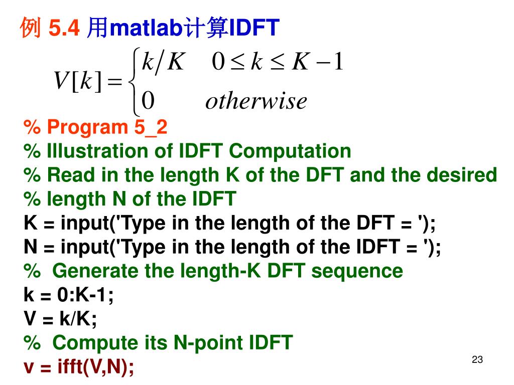 例 5.4用matlab计算IDFT % Program 5_2 % Illustration of IDFT Computation % Read in the length K of the DFT and the desired % length N of the IDFT K = input('Type in the length of the DFT = '); N = input('Type in the length of the IDFT = '); % Generate the length-K DFT sequence k = 0:K-1; V = k/K; % Compute its N-point IDFT v = ifft(V,N);