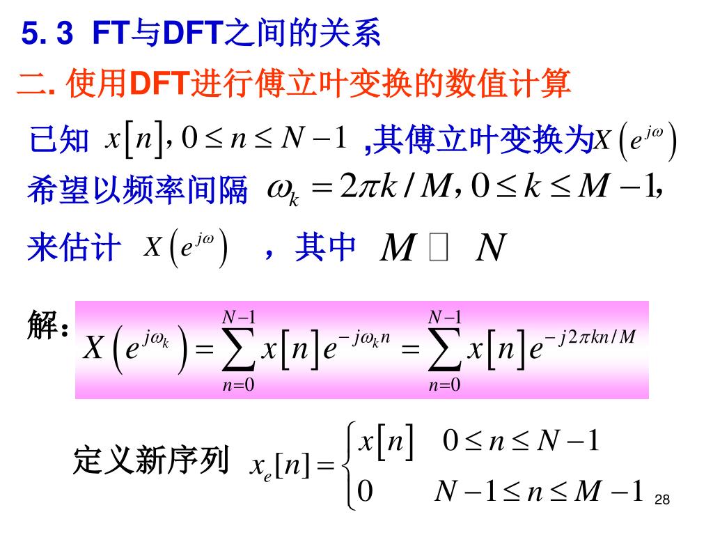 5. 3 FT与DFT之间的关系 二. 使用DFT进行傅立叶变换的数值计算 则: 上式是M点序列xe[n]的M点DFT序列Xe[k]