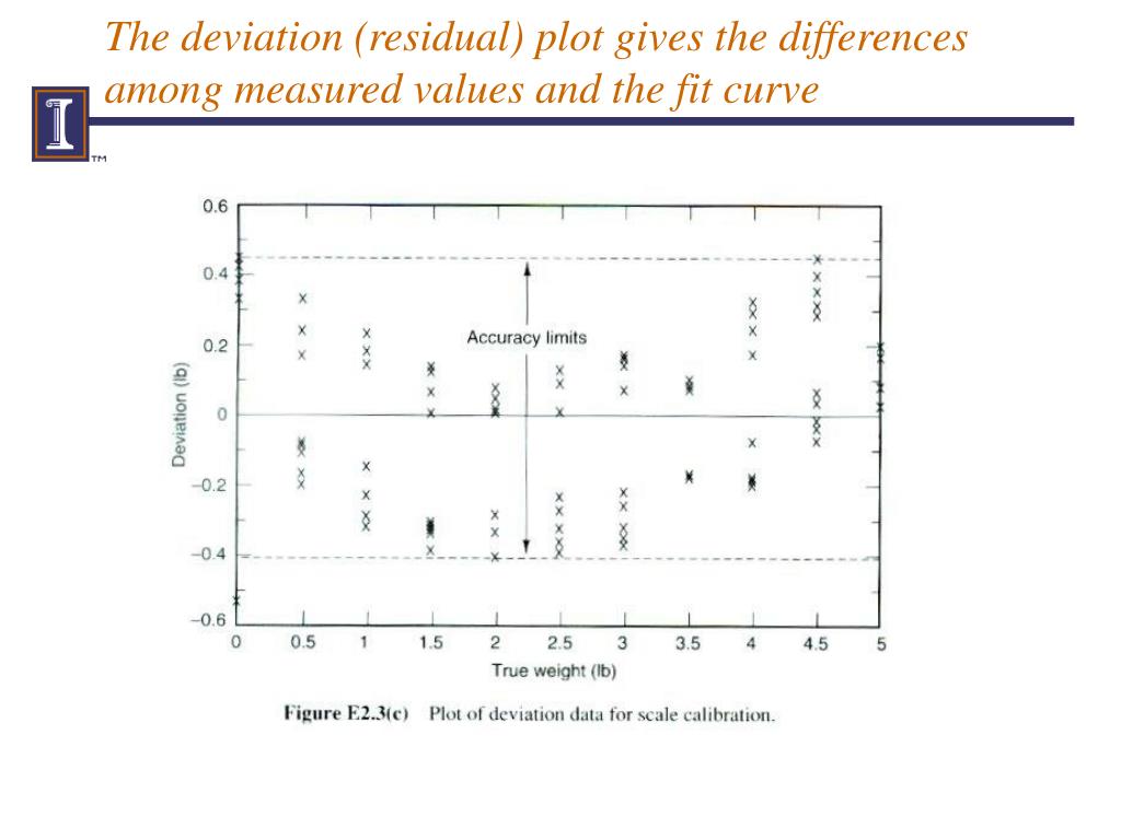 The deviation (residual) plot gives the differences among measured values and the fit curve