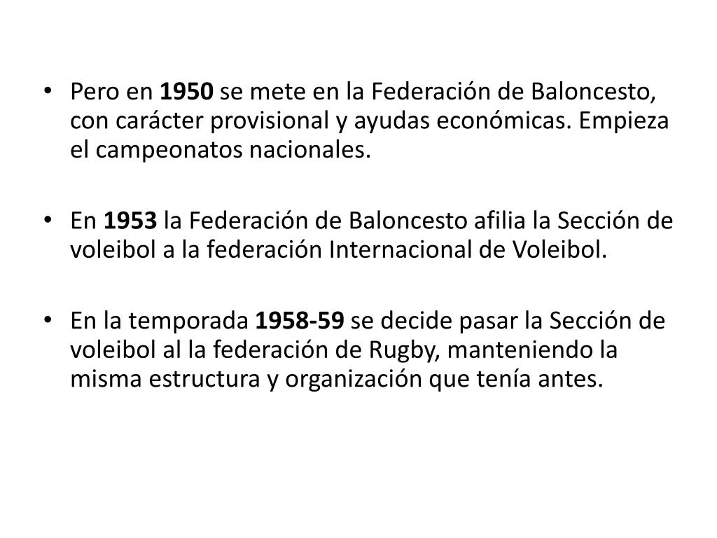 Pero en 1950 se mete en la Federación de Baloncesto, con carácter provisional y ayudas económicas. Empieza el campeonatos nacionales. • En 1953 la Federación de Baloncesto afilia la Sección de voleibol a la federación Internacional de Voleibol. • En la temporada 1958-59 se decide pasar la Sección de voleibol al la federación de Rugby, manteniendo la misma estructura y organización que tenía antes.