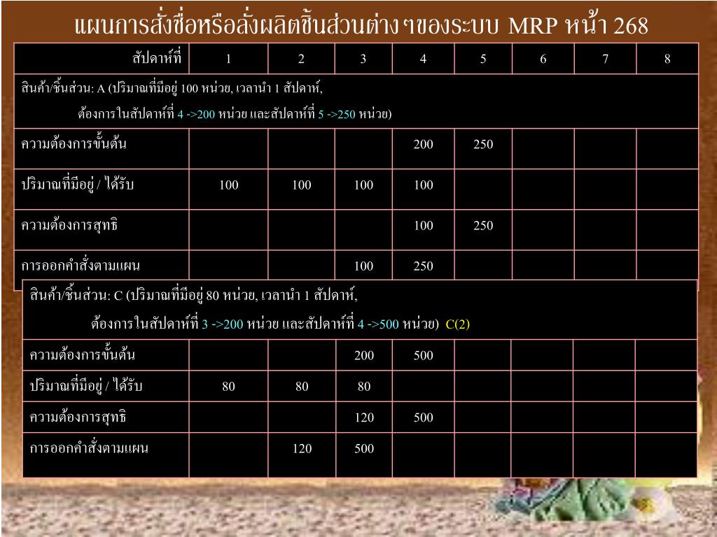 แผนการสั่งซื่อหรือลั่งผลิตชิ้นส่วนต่างๆของระบบ MRP หน้า 268