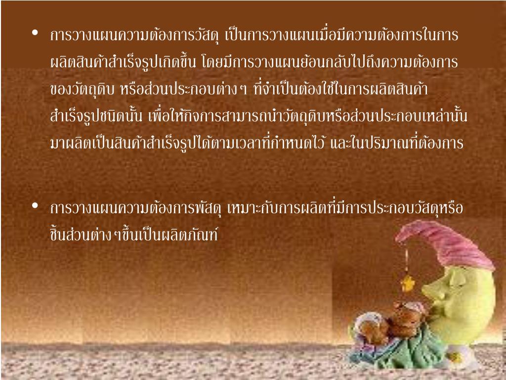 การวางแผนความต้องการวัสดุ เป็นการวางแผนเมื่อมีความต้องการในการผลิตสินค้าสำเร็จรูปเกิดขึ้น โดยมีการวางแผนย้อนกลับไปถึงความต้องการของวัตถุดิบ หรือส่วนประกอบต่างๆ ที่จำเป็นต้องใช้ในการผลิตสินค้าสำเร็จรูปชนิดนั้น เพื่อให้กิจการสามารถนำวัตถุดิบหรือส่วนประกอบเหล่านั้นมาผลิตเป็นสินค้าสำเร็จรูปได้ตามเวลาที่กำหนดไว้ และในปริมาณที่ต้องการ • การวางแผนความต้องการพัสดุ เหมาะกับการผลิตที่มีการประกอบวัสดุหรือชิ้นส่วนต่างๆขึ้นเป็นผลิตภัณฑ์