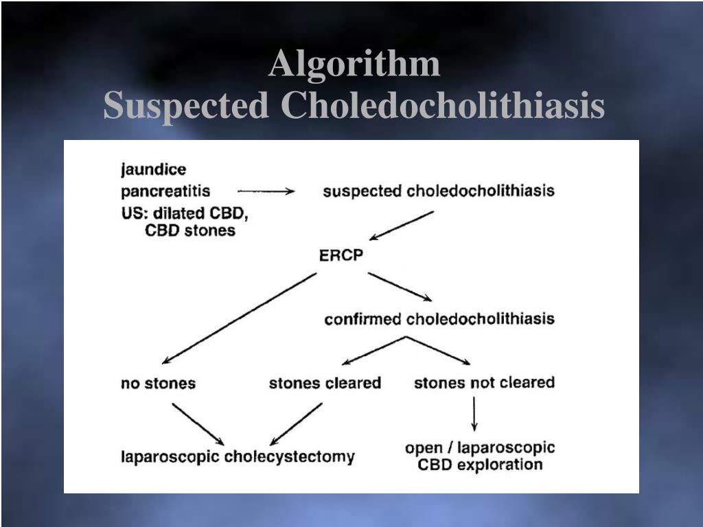 When to Suspect Choledocholithiasis? • Elevated bilirubin (jaundice) • Elevated lipase, amylase (pancreatitis) • Dilated CBD or stone(s) in CBD on ultrasound