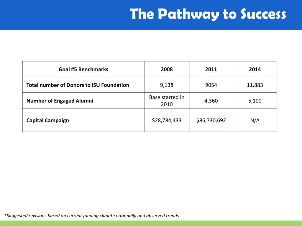 The Pathway to Success • Initiatives • 1. Enhance grant and contract activity • Strengthen the engagement of alumni in the life of • the University