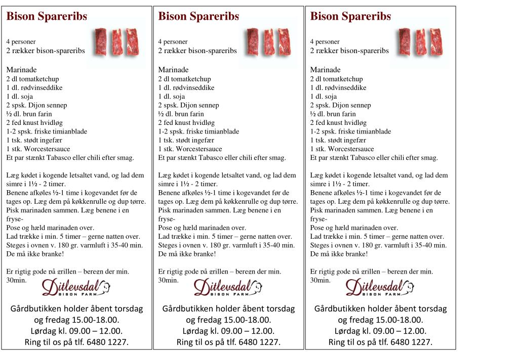 Bison Spareribs 4 personer 2 rækker bison-spareribs Marinade 2 dl tomatketchup 1 dl. rødvinseddike 1 dl. soja 2 spsk. Dijon sennep ½ dl. brun farin 2 fed knust hvidløg 1-2 spsk. friske timianblade 1 tsk. stødt ingefær 1 stk. Worcestersauce Et par stænkt Tabasco eller chili efter smag. Læg kødet i kogende letsaltet vand, og lad dem simre i 1½ - 2 timer. Benene afkøles ½-1 time i kogevandet før de tages op. Læg dem på køkkenrulle og dup tørre. Pisk marinaden sammen. Læg benene i en fryse- Pose og hæld marinaden over. Lad trække i min. 5 timer – gerne natten over. Steges i ovnen v. 180 gr. varmluft i 35-40 min. De må ikke branke! Er rigtig gode på grillen – beregn der min. 30min. Bison Spareribs 4 personer 2 rækker bison-spareribs Marinade 2 dl tomatketchup 1 dl. rødvinseddike 1 dl. soja 2 spsk. Dijon sennep ½ dl. brun farin 2 fed knust hvidløg 1-2 spsk. friske timianblade 1 tsk. stødt ingefær 1 stk. Worcestersauce Et par stænkt Tabasco eller chili efter smag. Læg kødet i kogende letsaltet vand, og lad dem simre i 1½ - 2 timer. Benene afkøles ½-1 time i kogevandet før de tages op. Læg dem på køkkenrulle og dup tørre. Pisk marinaden sammen. Læg benene i en fryse- Pose og hæld marinaden over. Lad trække i min. 5 timer – gerne natten over. Steges i ovnen v. 180 gr. varmluft i 35-40 min. De må ikke branke! Er rigtig gode på grillen – beregn der min. 30min. Bison Spareribs 4 personer 2 rækker bison-spareribs Marinade 2 dl tomatketchup 1 dl. rødvinseddike 1 dl. soja 2 spsk. Dijon sennep ½ dl. brun farin 2 fed knust hvidløg 1-2 spsk. friske timianblade 1 tsk. stødt ingefær 1 stk. Worcestersauce Et par stænkt Tabasco eller chili efter smag. Læg kødet i kogende letsaltet vand, og lad dem simre i 1½ - 2 timer. Benene afkøles ½-1 time i kogevandet før de tages op. Læg dem på køkkenrulle og dup tørre. Pisk marinaden sammen. Læg benene i en fryse- Pose og hæld marinaden over. Lad trække i min. 5 timer – gerne natten over. Steges i ovnen v. 180 gr. varmluft i 35-40 min. De må ikke branke! Er rigtig gode på grillen – beregn der min. 30min. Gårdbutikken holder åbent torsdag og fredag 15.00-18.00. Lørdag kl. 09.00 – 12.00. Ring til os på tlf. 6480 1227. Gårdbutikken holder åbent torsdag og fredag 15.00-18.00. Lørdag kl. 09.00 – 12.00. Ring til os på tlf. 6480 1227. Gårdbutikken holder åbent torsdag og fredag 15.00-18.00. Lørdag kl. 09.00 – 12.00. Ring til os på tlf. 6480 1227.