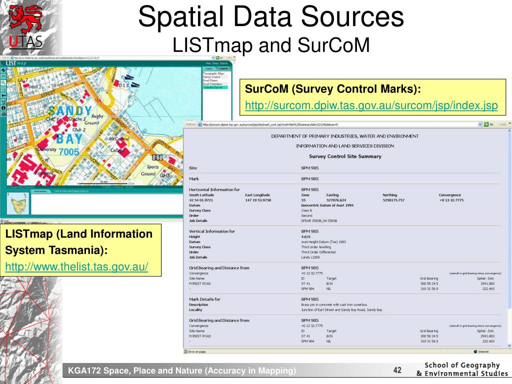 Spatial Data Sources LISTmap and SurCoM SurCoM (Survey Control Marks): http://surcom.dpiw.tas.gov.au/surcom/jsp/index.jsp LISTmap (Land Information System Tasmania): http://www.thelist.tas.gov.au/