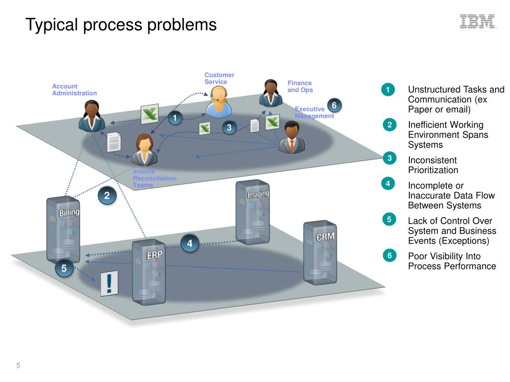 1 3 6 5 2 4 Typical process problems Customer Service Finance and Ops Account Administration • Unstructured Tasks and Communication (ex Paper or email) • Inefficient Working Environment Spans Systems • Inconsistent Prioritization • Incomplete or Inaccurate Data Flow Between Systems • Lack of Control Over System and Business Events (Exceptions) • Poor Visibility Into Process Performance 1 Executive Management 2 3 Invoice Reconciliation Teams 4 5 6 5