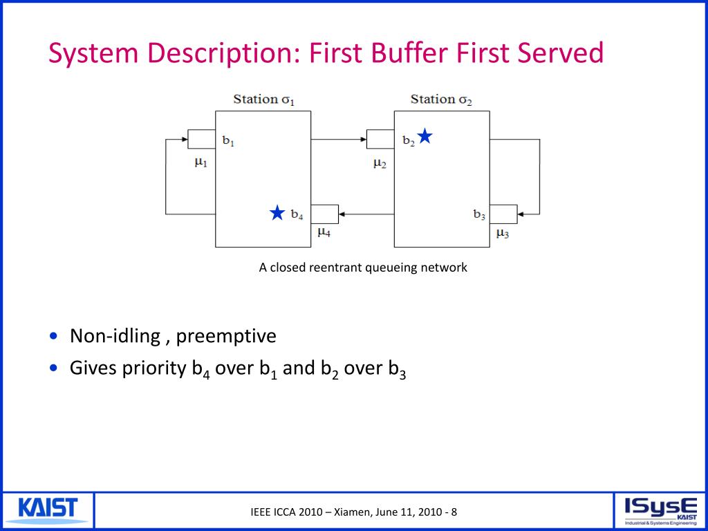 System Description: Last Buffer First Served • Non-idling , preemptive • Gives priority b1 over b4 and b3 over b2 • A closed reentrant queueing network