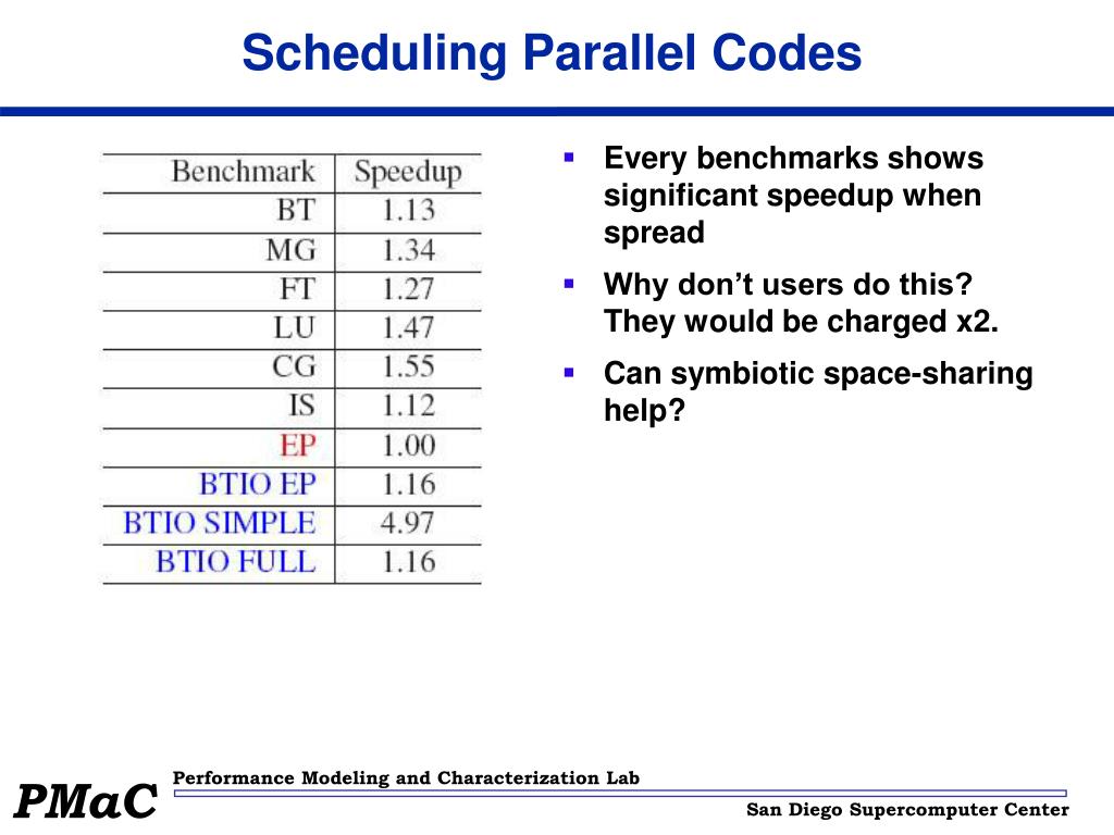 Scheduling Parallel Codes • Choose some seemingly symbiotic combinations • Maintain speedup even with no idle processors • CG slows down when run with BTIO(S)…