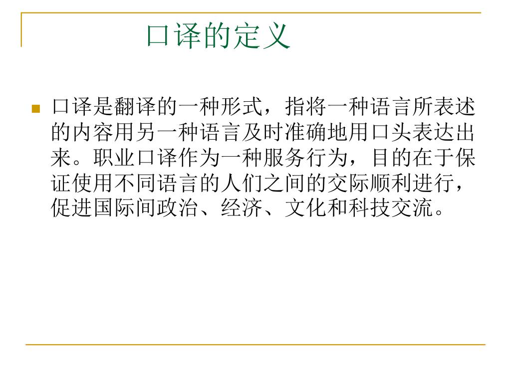 口译的定义 • 口译是翻译的一种形式,指将一种语言所表述的内容用另一种语言及时准确地用口头表达出来。职业口译作为一种服务行为,目的在于保证使用不同语言的人们之间的交际顺利进行,促进国际间政治、经济、文化和科技交流。
