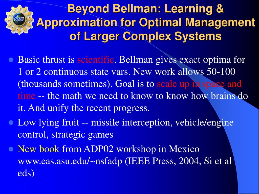 Beyond Bellman: Learning & Approximation for Optimal Management of Larger Complex Systems • Basic thrust is scientific. Bellman gives exact optima for 1 or 2 continuous state vars. New work allows 50-100 (thousands sometimes). Goal is to scale up in space and time -- the math we need to know to know how brains do it. And unify the recent progress. • Low lying fruit -- missile interception, vehicle/engine control, strategic games • New book from ADP02 workshop in Mexico www.eas.asu.edu/~nsfadp (IEEE Press, 2004, Si et al eds)