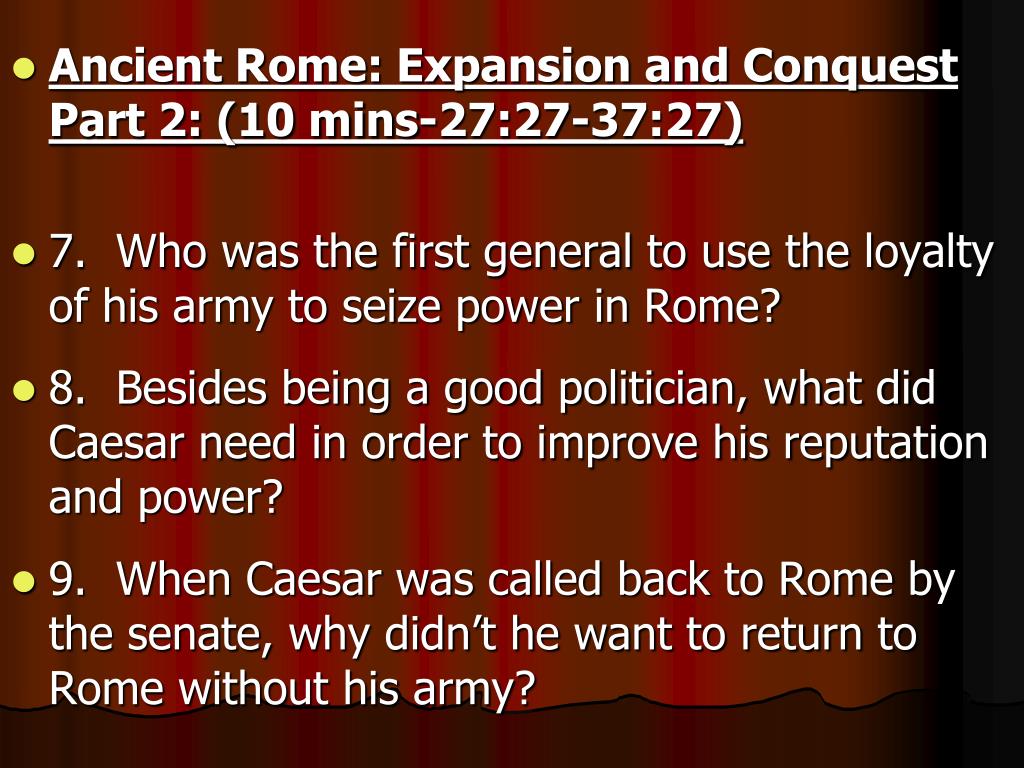Ancient Rome: Expansion and Conquest Part 2: (10 mins-27:27-37:27) • 7. Who was the first general to use the loyalty of his army to seize power in Rome? • 8. Besides being a good politician, what did Caesar need in order to improve his reputation and power? • 9. When Caesar was called back to Rome by the senate, why didn’t he want to return to Rome without his army?
