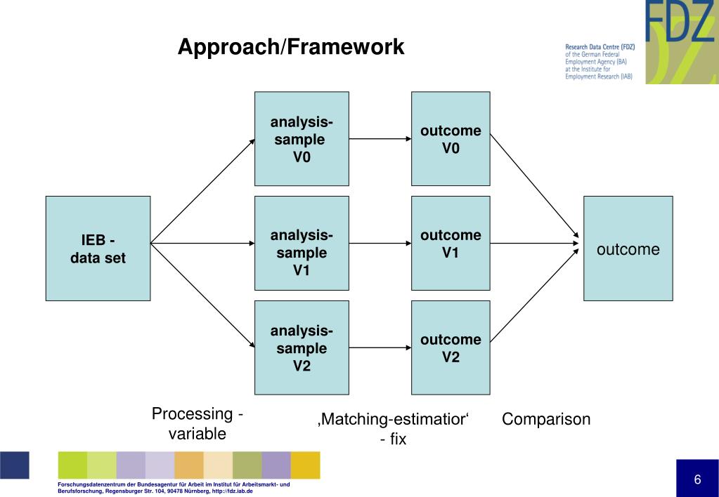 Approach/Framework analysis- sample V0 outcome V0 IEB - data set analysis- sample V1 outcome V1 outcome analysis- sample V2 outcome V2 Processing - variable ‚Matching-estimatior‘ - fix Comparison