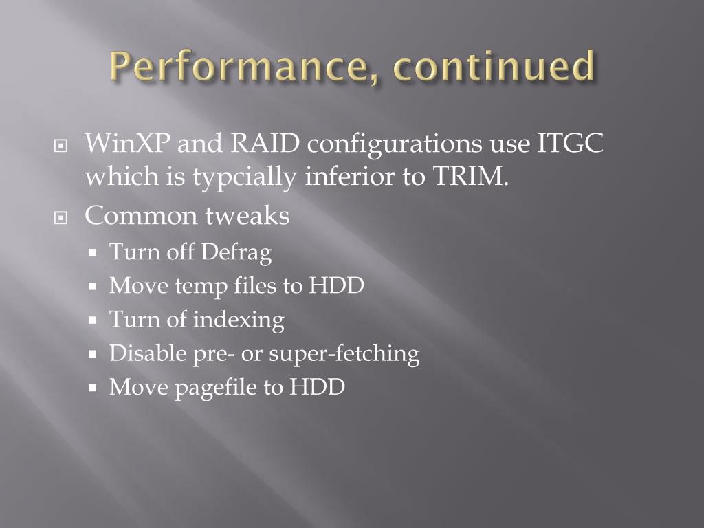 Performance, continued • WinXP and RAID configurations use ITGC which is typcially inferior to TRIM. • Common tweaks • Turn off Defrag • Move temp files to HDD • Turn of indexing • Disable pre- or super-fetching • Move pagefile to HDD