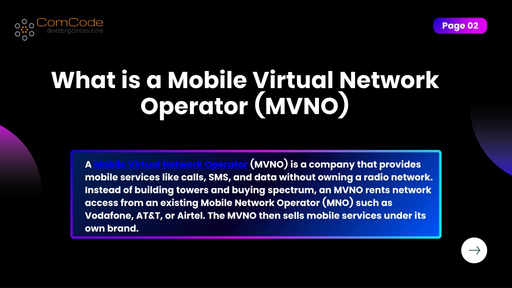 Page 02 • What is a Mobile Virtual Network Operator (MVNO) A Mobile Virtual Network Operator (MVNO) is a company that provides mobile services like calls, SMS, and data without owning a radio network. Instead of building towers and buying spectrum, an MVNO rents network access from an existing Mobile Network Operator (MNO) such as Vodafone, AT&T, or Airtel. The MVNO then sells mobile services under its own brand.