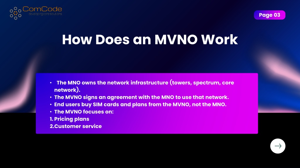 Page 03 • How Does an MVNO Work • The MNO owns the network infrastructure (towers, spectrum, core network). • The MVNO signs an agreement with the MNO to use that network. • End users buy SIM cards and plans from the MVNO, not the MNO. • The MVNO focuses on: • Pricing plans • Customer service