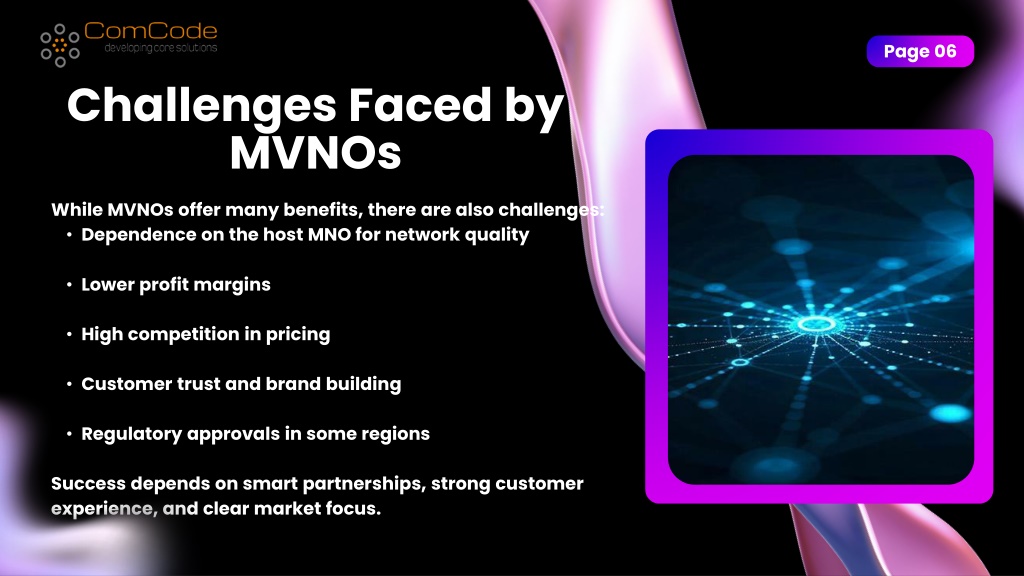 Page 06 • Challenges Faced by MVNOs • While MVNOs offer many benefits, there are also challenges: • Dependence on the host MNO for network quality • Lower profit margins • High competition in pricing • Customer trust and brand building • Regulatory approvals in some regions • Success depends on smart partnerships, strong customer experience, and clear market focus.